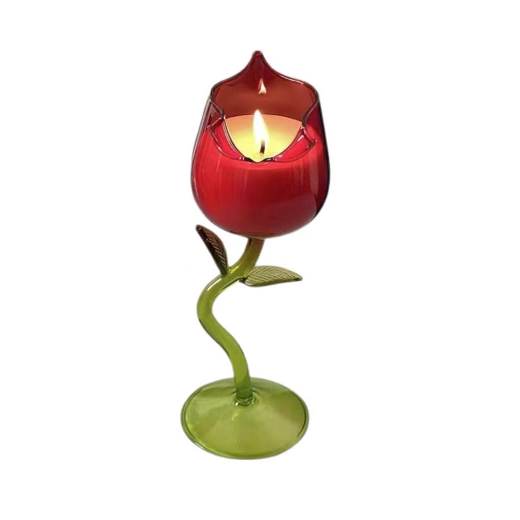 Artisanal Design: A unique red rose-shaped glass cup that serves as a stunning decorative accent on a desk or vanity, even unlit.